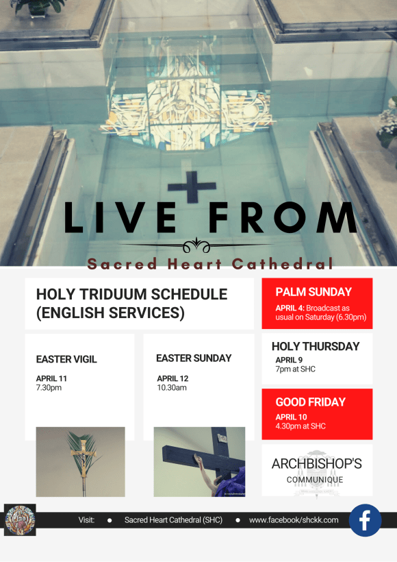 Since St Simon Catholic Church Likas is an English-speaking parish, its Soccom Ministry highlighted the timings for services in the language, which would be live-streamed from Sacred Heart Cathedral KK’s Facebook page, based on the timings below: